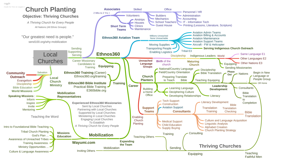 Missions – Another part of why is showing people what is involved in establishing thriving churches of Christians who are able to carry on the work of the ministry and multiply workers long after the missionaries have departed. One part is showing the process with the objective in mind. Another part is showing the teamwork and individual gifts or skills that are needed for the team to succeed in this Body function of church planting. e.g. Big Picture (link to other page? or import jpg?) and